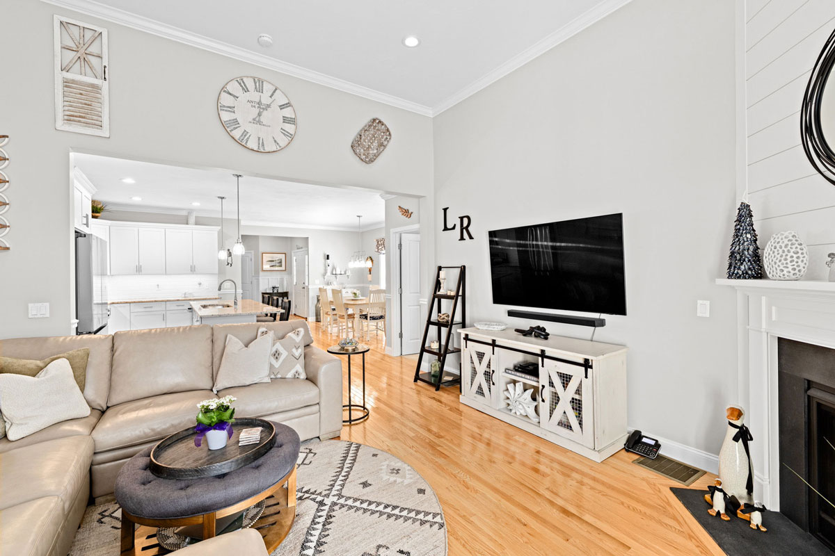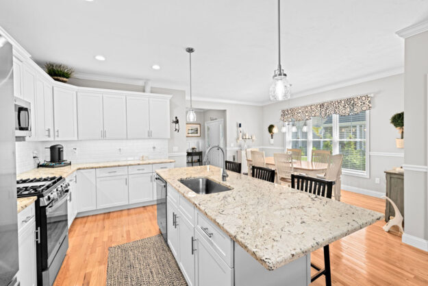 The chef’s kitchen is a true centerpiece, featuring a granite island, stainless-steel appliances, and generous cabinetry, all flowing seamlessly into the dining area and spacious great room with vaulted ceilings and a cozy gas fireplace.