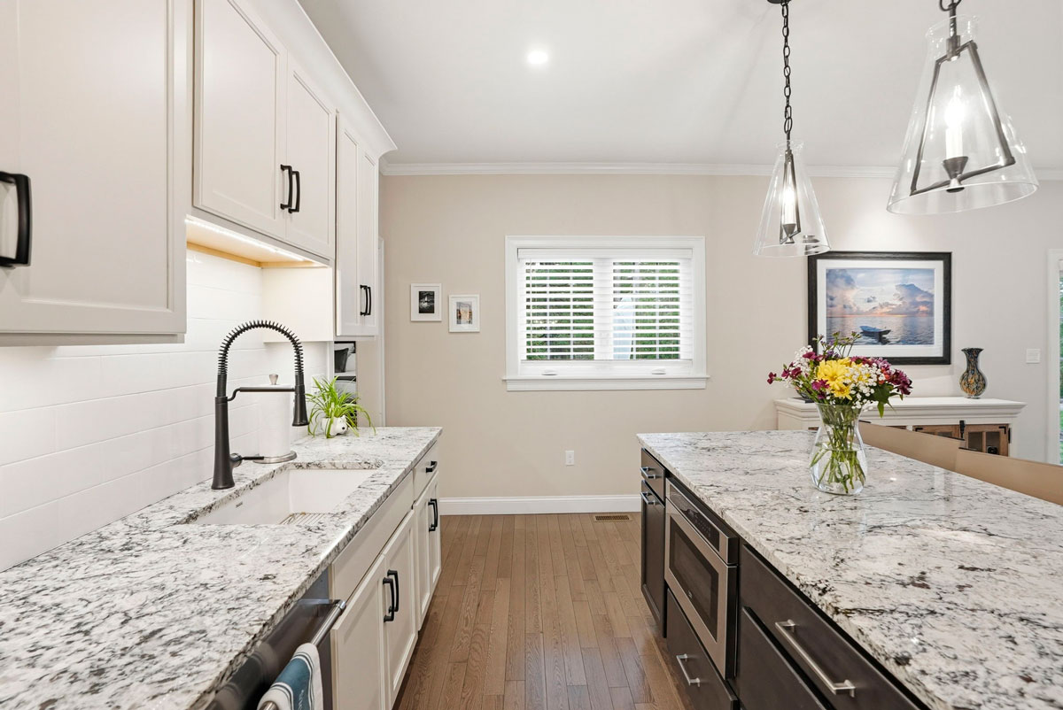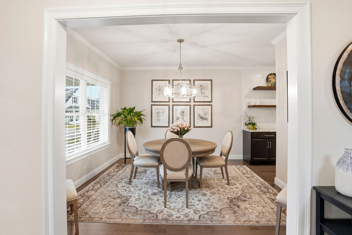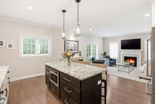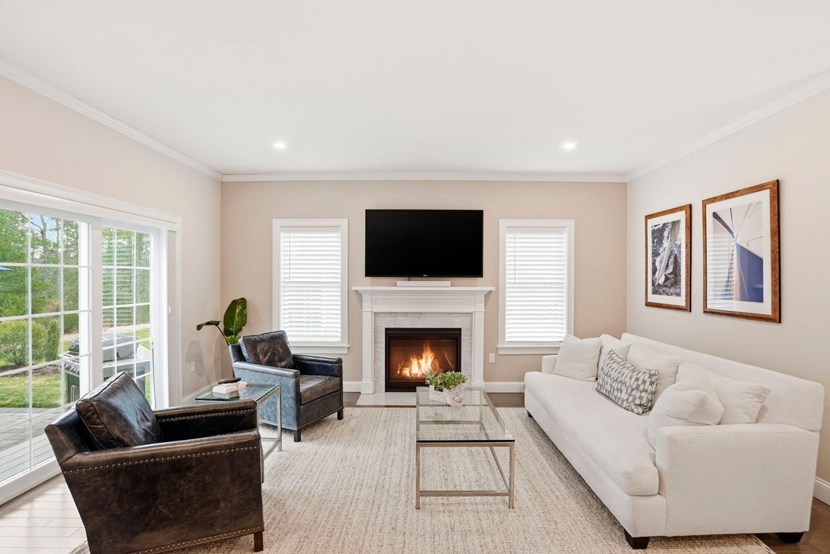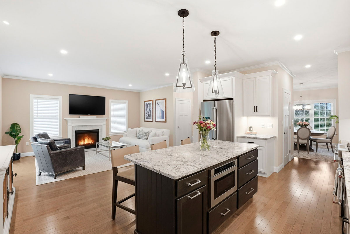Welcome to The White Pine, where charm and thoughtful design come together. A welcoming farmer’s porch leads into a bright, open-concept living space featuring crown molding, a gas fireplace, and slider access to an expanded hardscaped patio with a cozy outdoor fireplace. The kitchen offers granite countertops, stainless steel appliances, a large center island, and an oversized walk-in pantry with coffee bar connecting to the formal dining room.