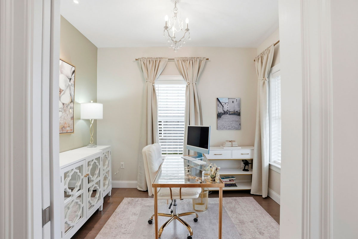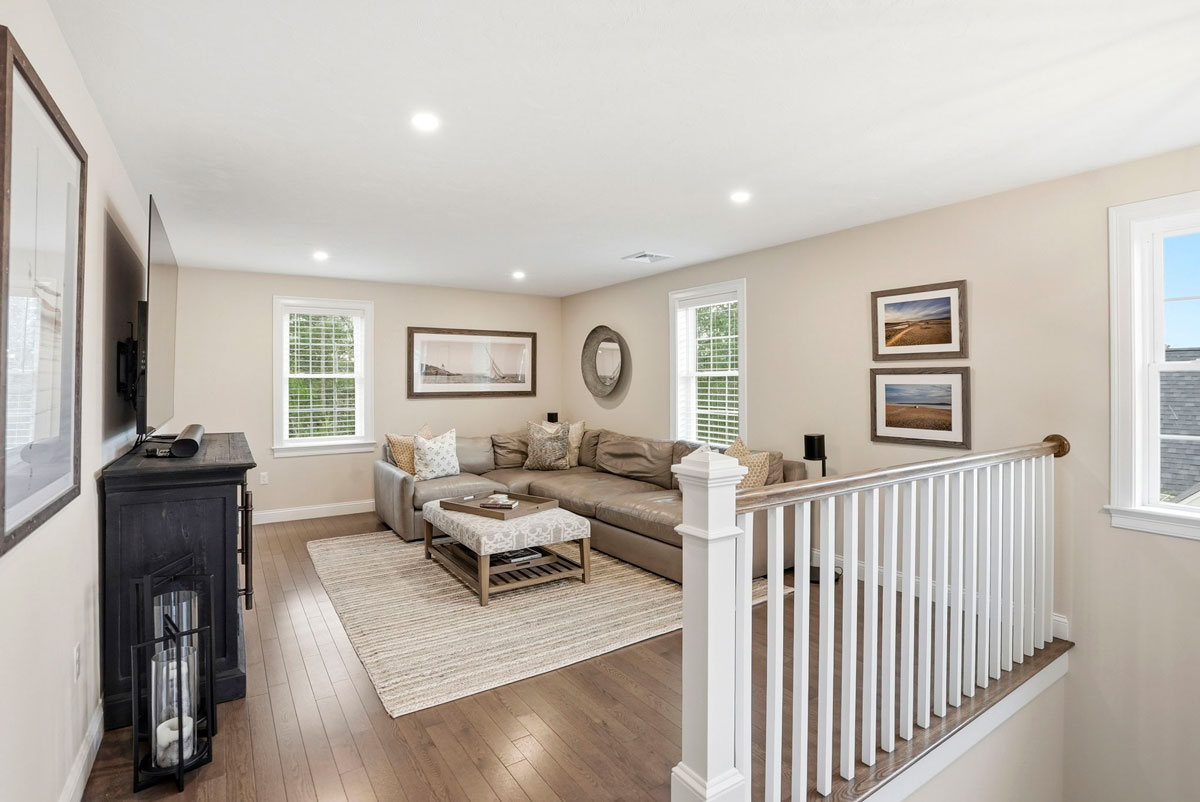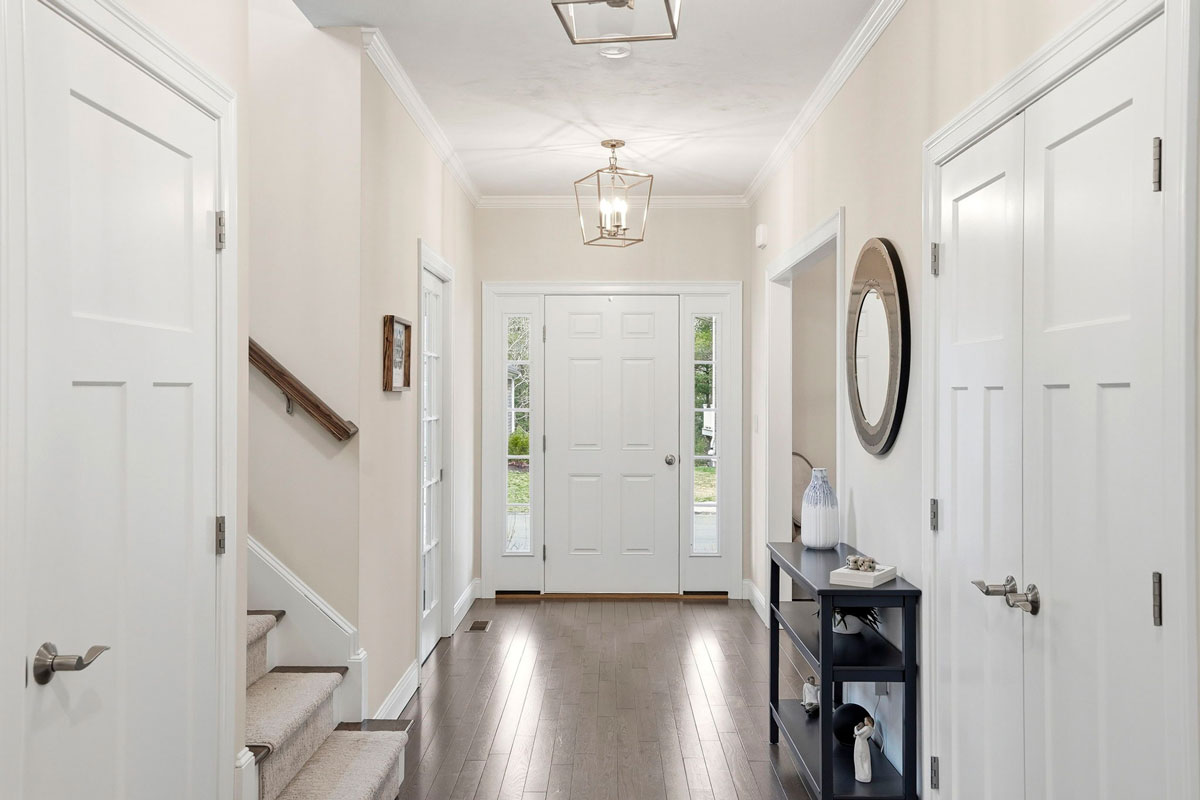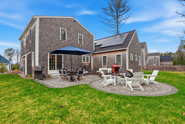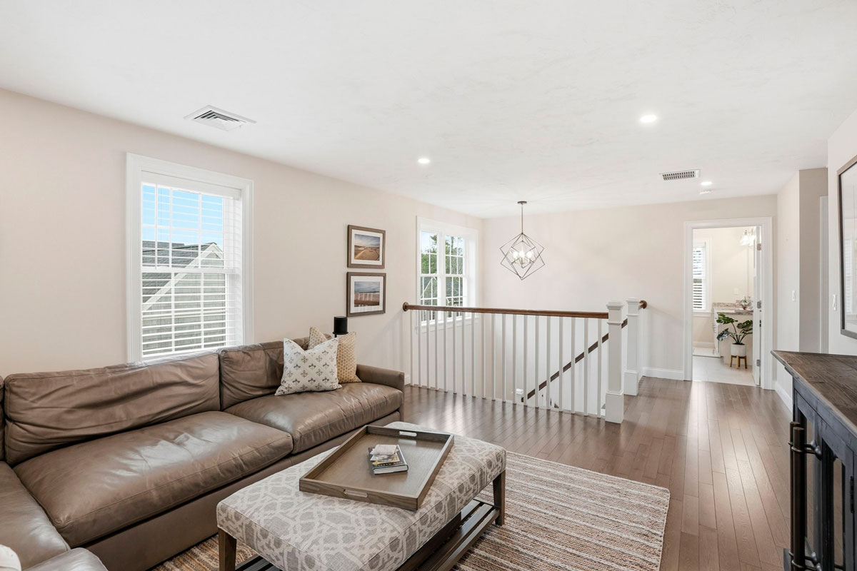 The first-floor primary suite includes hardwood floors, a tray ceiling, spa-style bath, and custom oversized closet. A private office, mudroom, half bath, and separate laundry complete the main level. Upstairs features a spacious loft, two bedrooms, and a full bath. Seller-owned Tesla solar panels with backup battery add efficiency and value—all just steps from walking trails, dining, the Old Colony YMCA, Deer Pond, The Village Green, and a local bakery and coffee shop. Welcome Home!