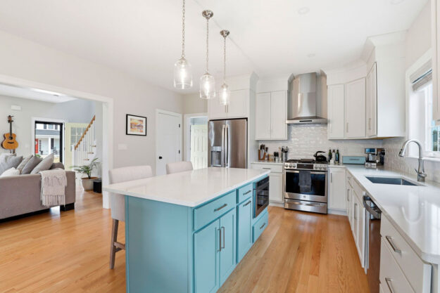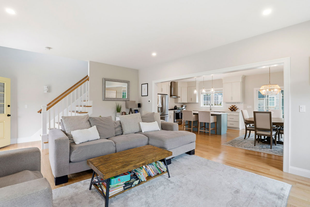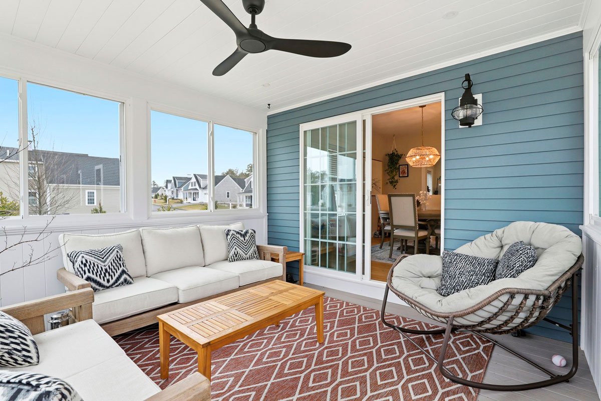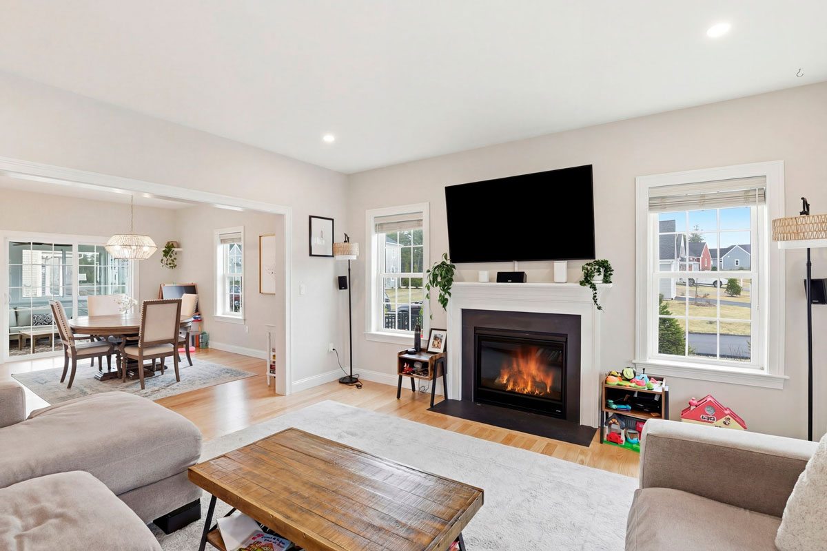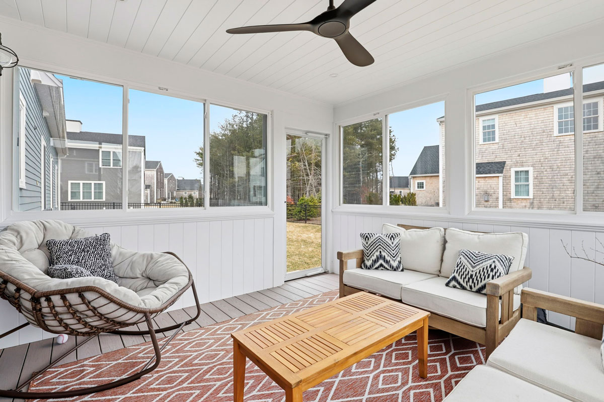 Sunlight fills the living room, where hardwood floors and a gas fireplace create an inviting gathering space. The kitchen and dining area are designed for everyday living and entertaining, featuring quartz countertops, ceiling-height cabinetry, stainless steel appliances, a custom backsplash, statement pendant lighting, and a spacious island. A slider opens to the screened three-season porch with beadboard detail and composite flooring for seamless indoor-outdoor living.