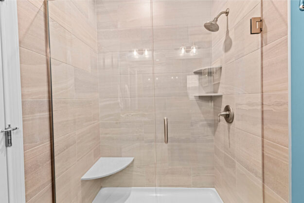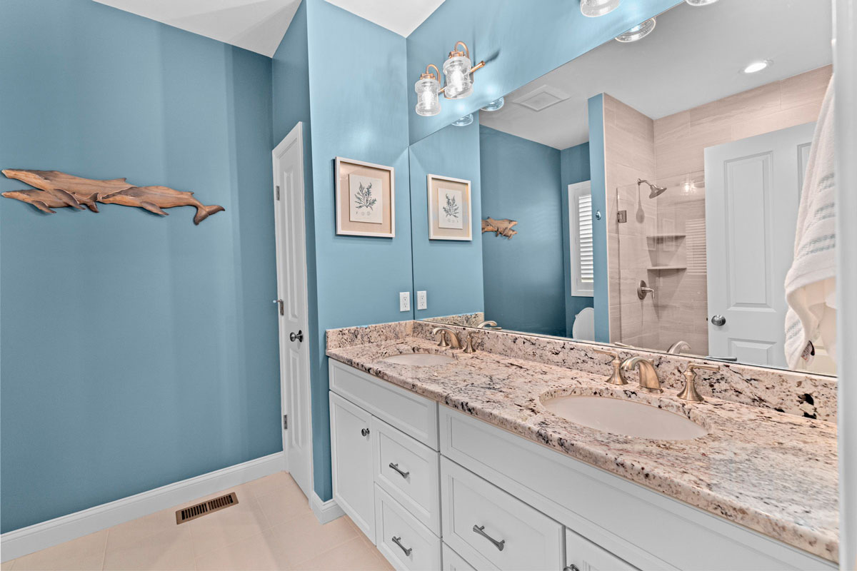 - Spa-like primary bath with double vanity and glass-enclosed shower