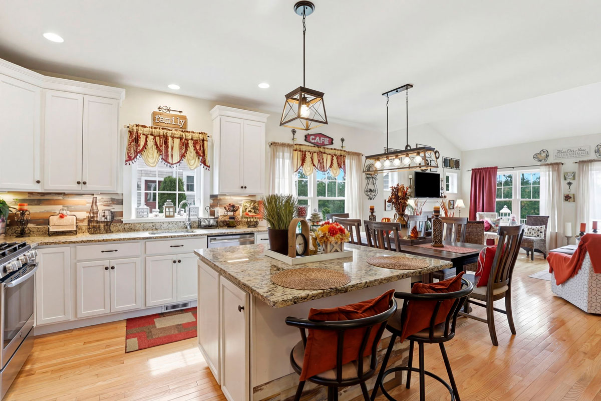 Large granite kitchen island open to dining and living rooms
