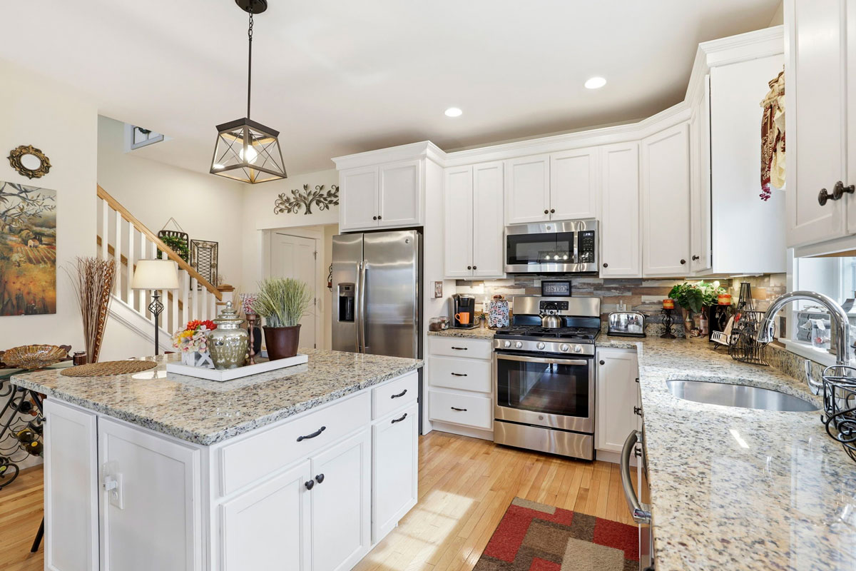 The heart of the home is a stunning kitchen with a large granite island, stainless steel appliances, and plenty of room to connect with family and friends. The living room, anchored by a cozy fireplace and a wall of windows, offers seamless access to the outdoors and backyard deck, perfect for quiet mornings or golden-hour evenings.