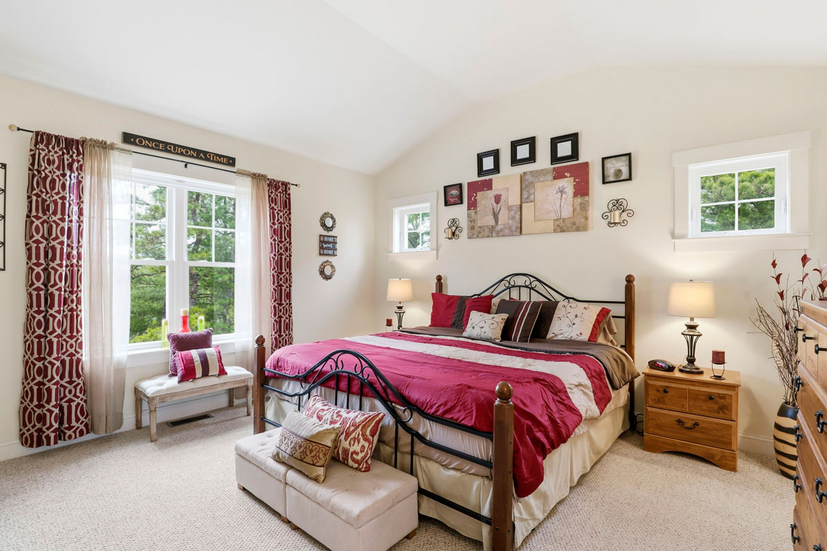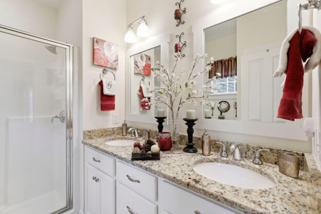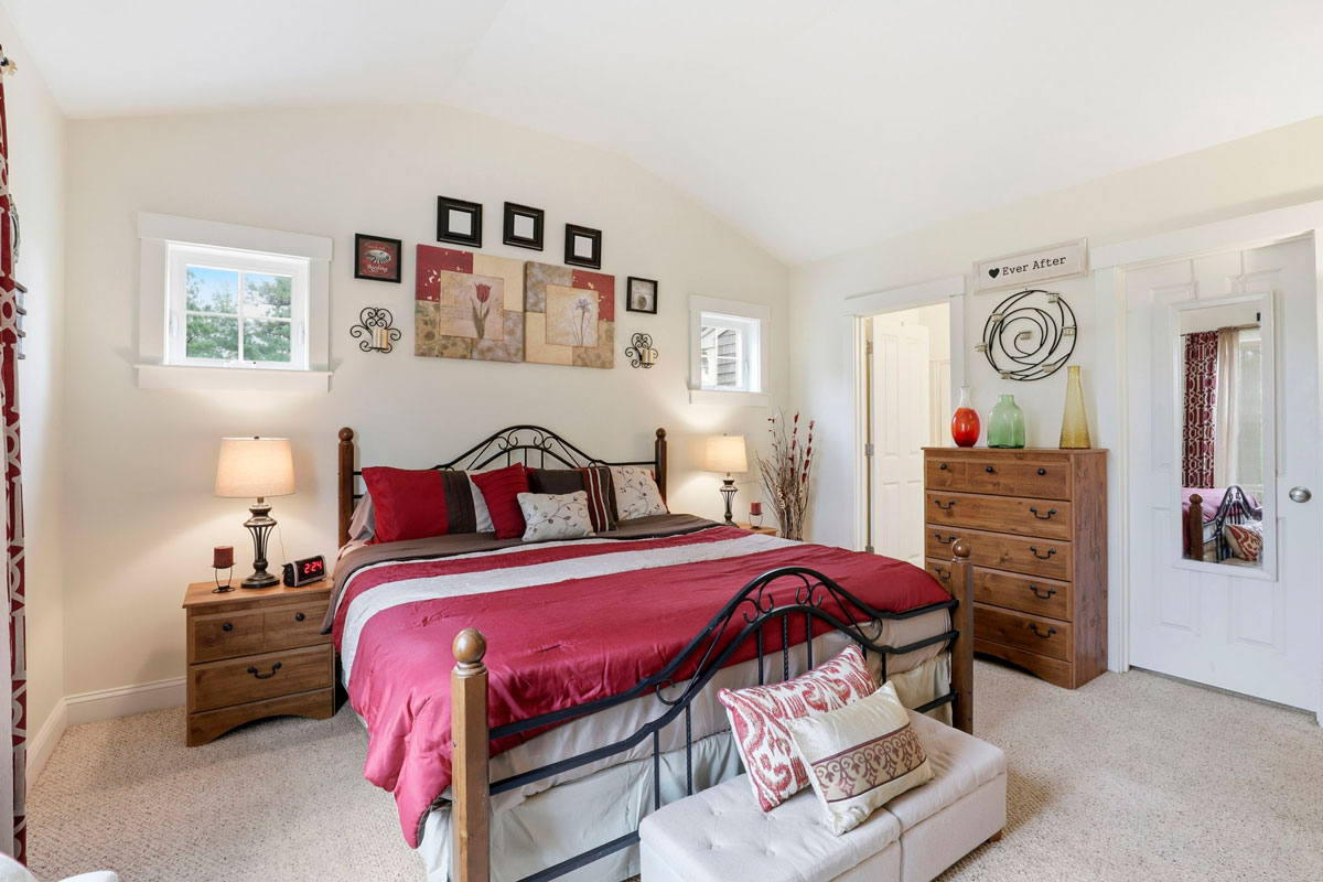 - First-floor primary suite with vaulted ceilings, walk-in closet & double vanity bath