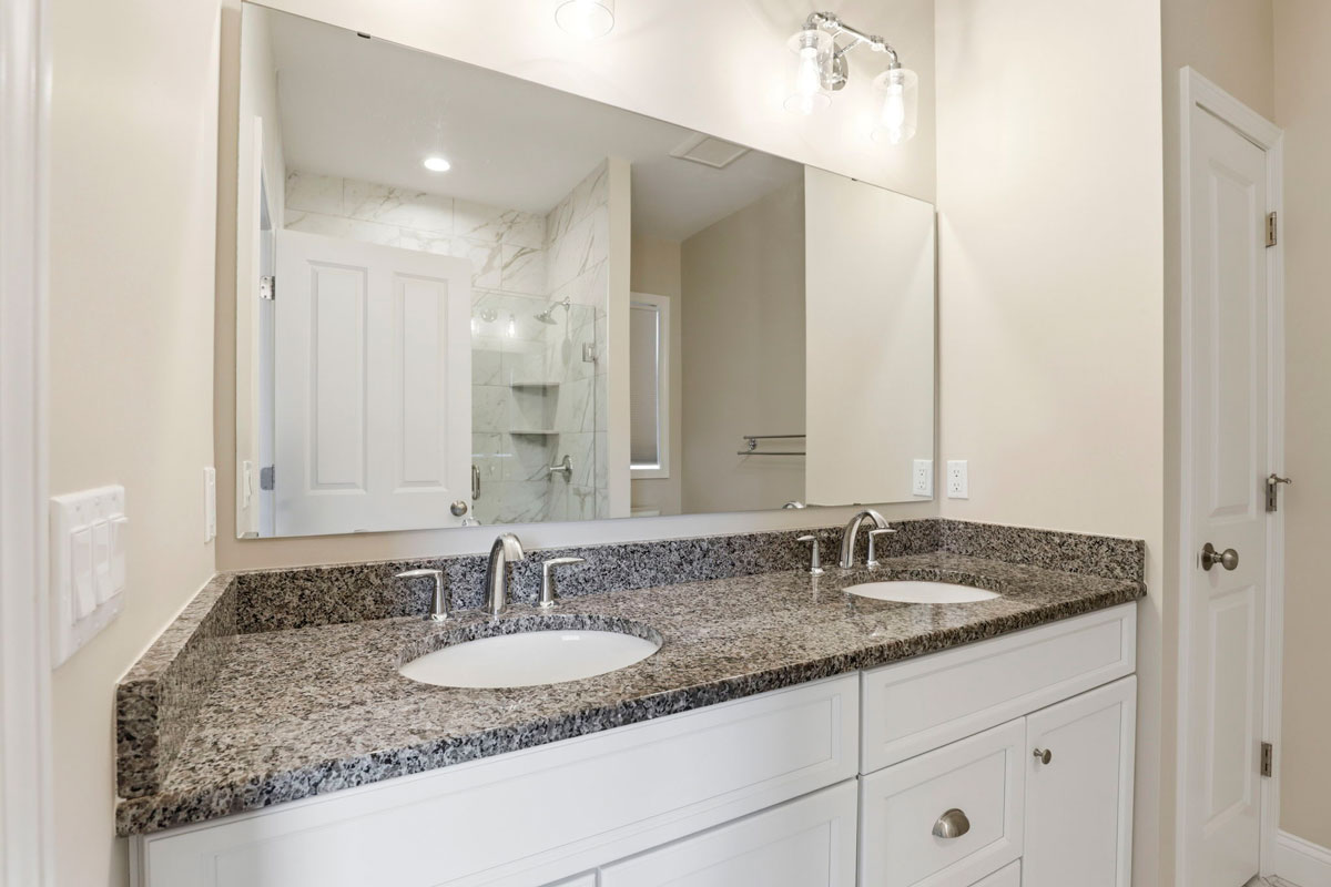 - Upgraded primary bath with double vanity and tiled, glass-enclosed shower
