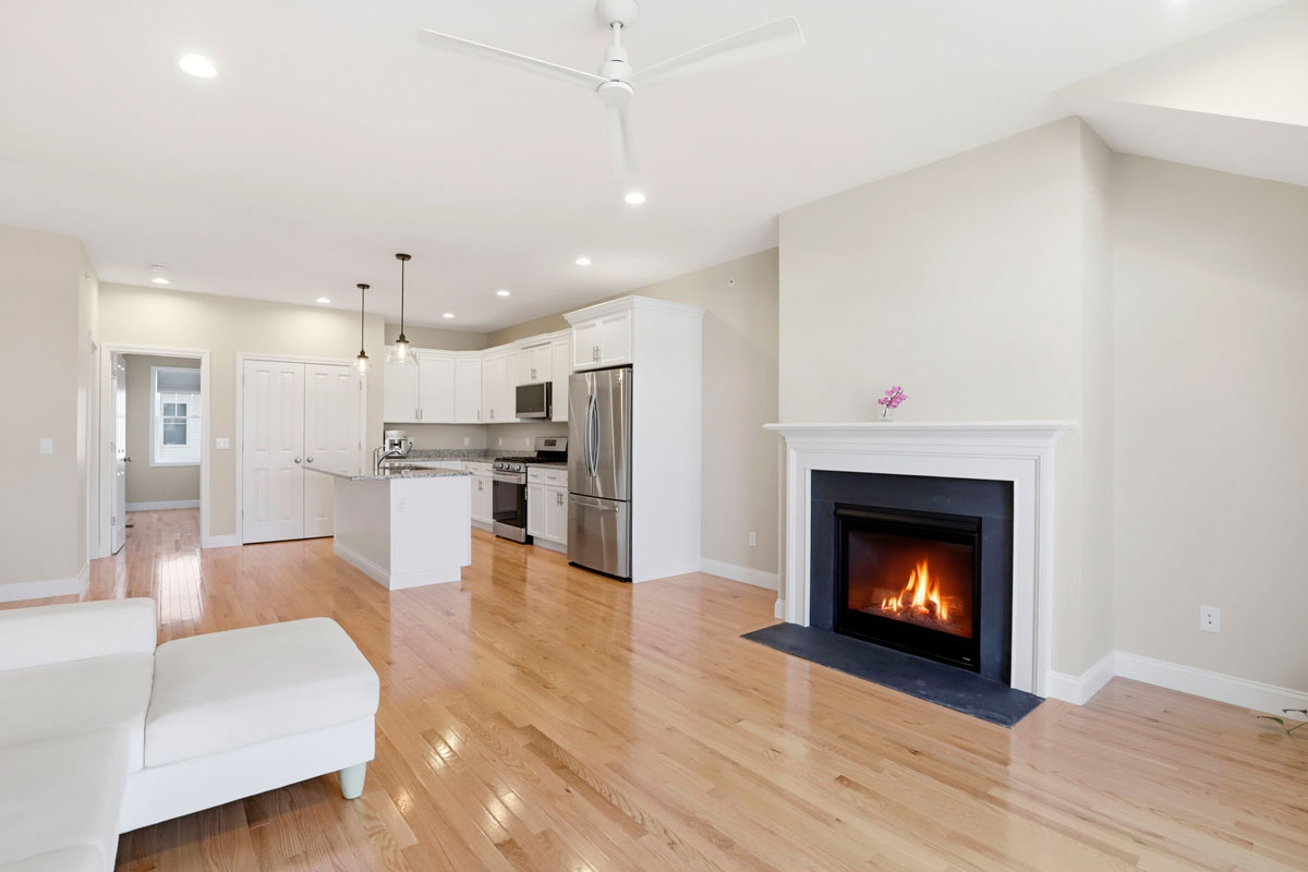 5-burner gas range - High ceilings in dining and living areas with a gas fireplace