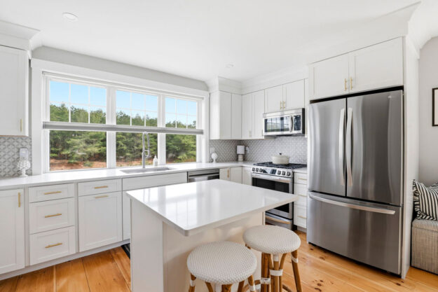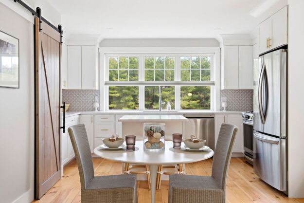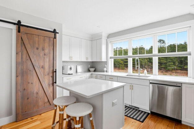 - Charming kitchen with quartz island, hidden barn-door pantry, ceiling-height white cabinets with crown moulding, and soft, welcoming glow that makes cooking a joy