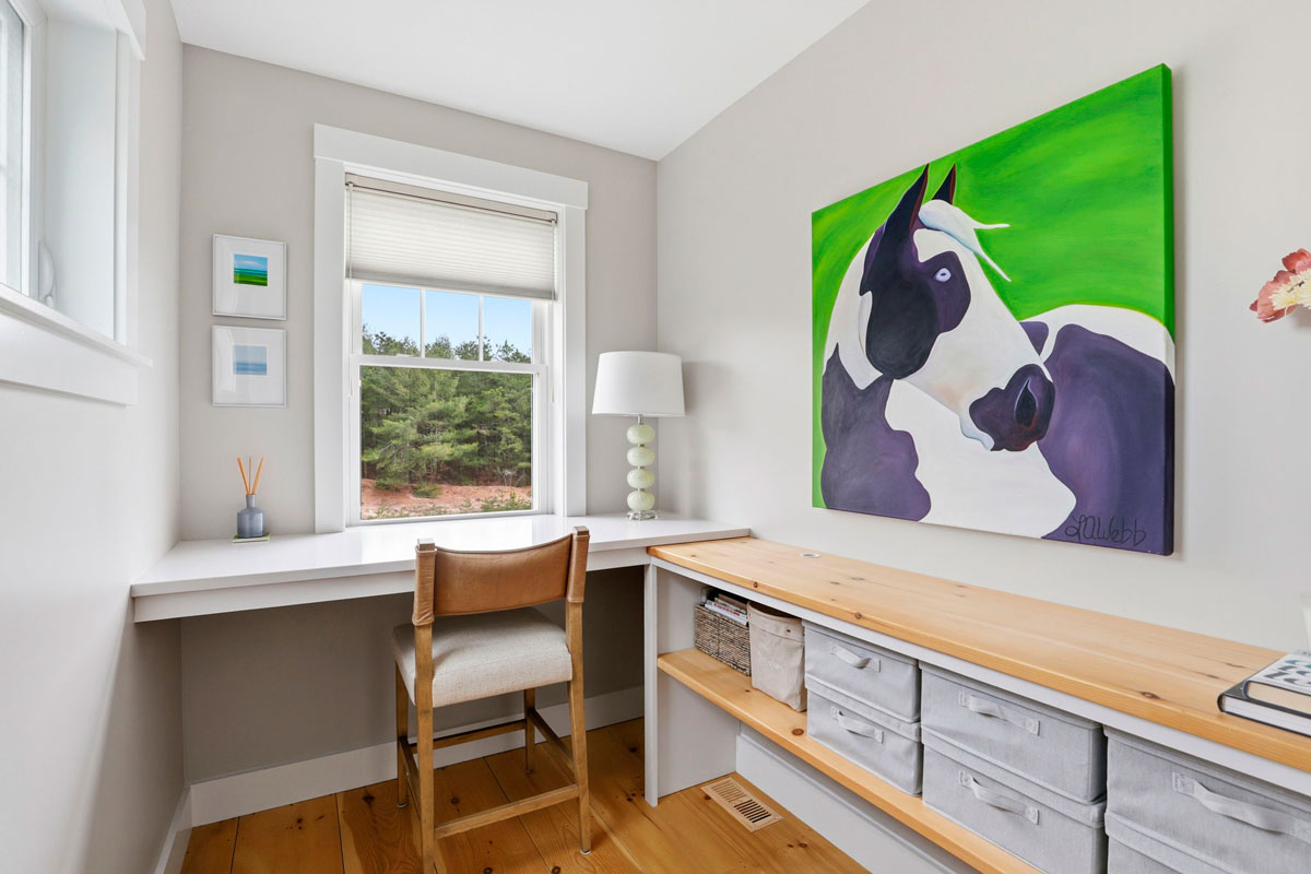 - First-floor home office with custom built-in quartz desk and pine shelving