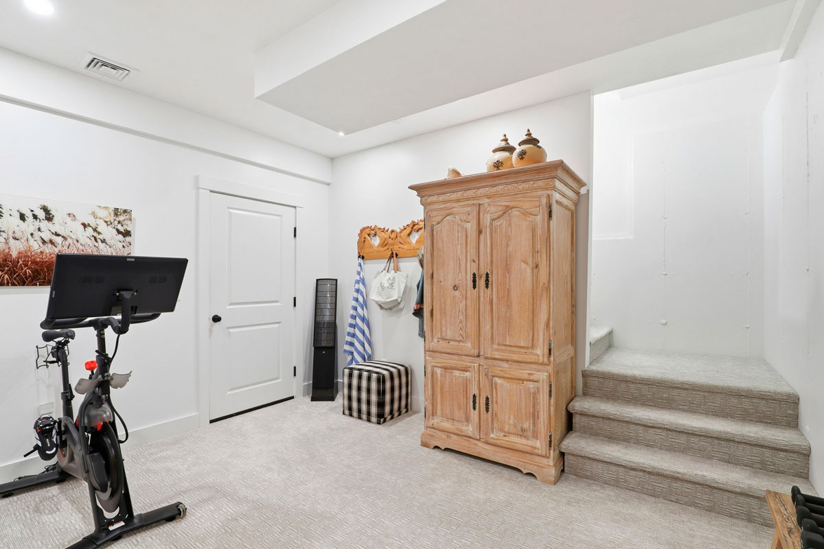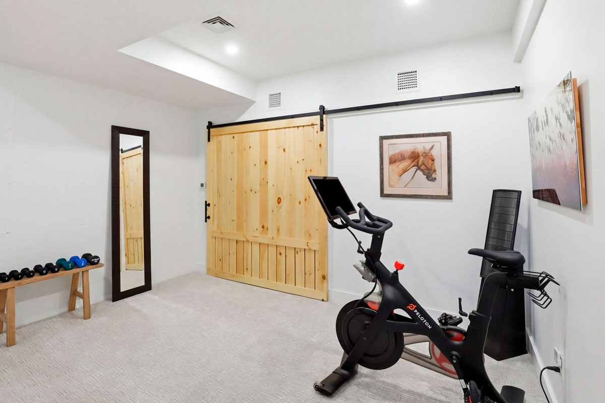 - Finished lower level with custom sliding barn door, ideal for a home gym, art studio, or movie room