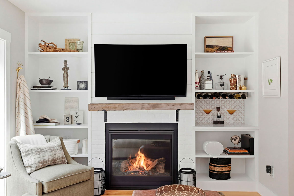 - Living room with glowing gas fireplace, custom built-ins, and beautifully appointed wine bar—perfect for cozy evenings