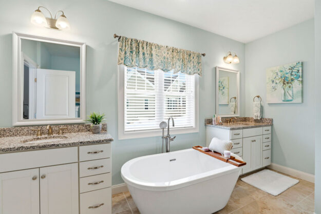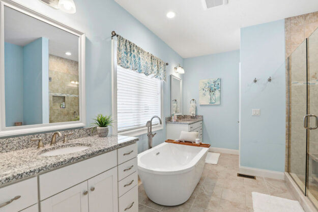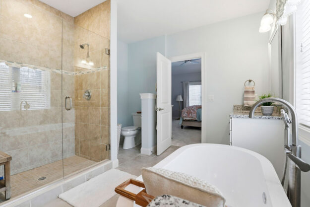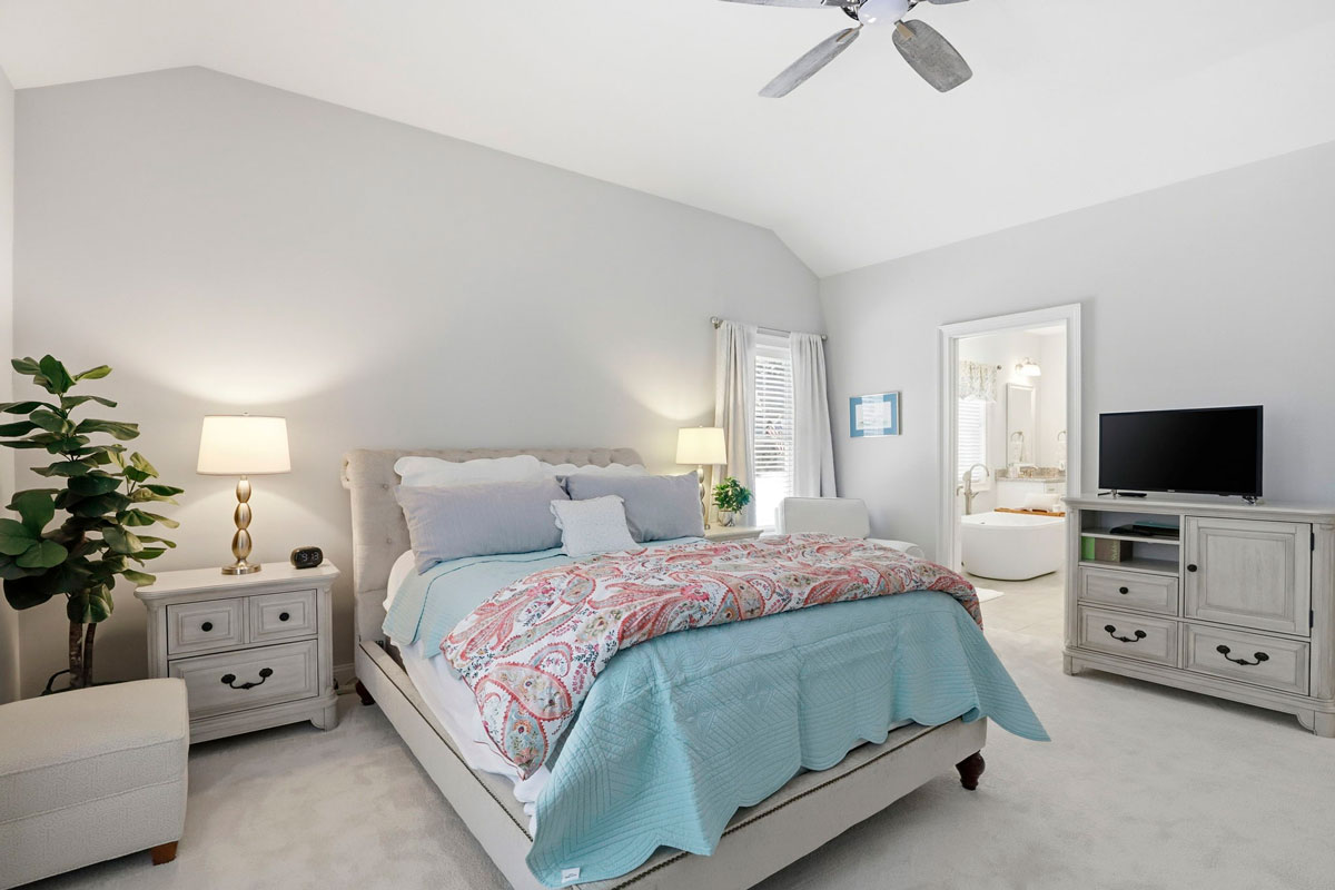 - Primary Suite: Vaulted ceilings, large walk-in closet with custom shelving, and a spa-like bath with dual sinks, glass-tiled shower, and soaking tub