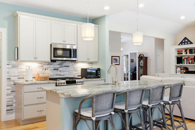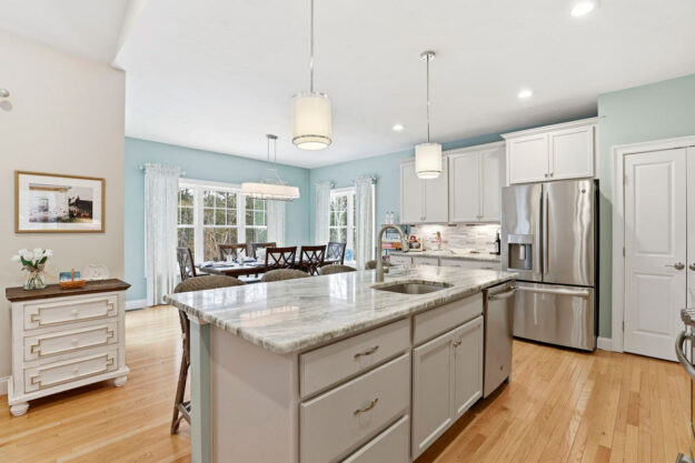 - Spacious Kitchen: Open layout to the dining area, stainless steel appliances, bright white cabinetry, granite countertops, custom tile backsplash, and large center island