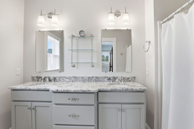 - First-Floor Primary Suite Ensuite with a walk-in closet and double vanity bath